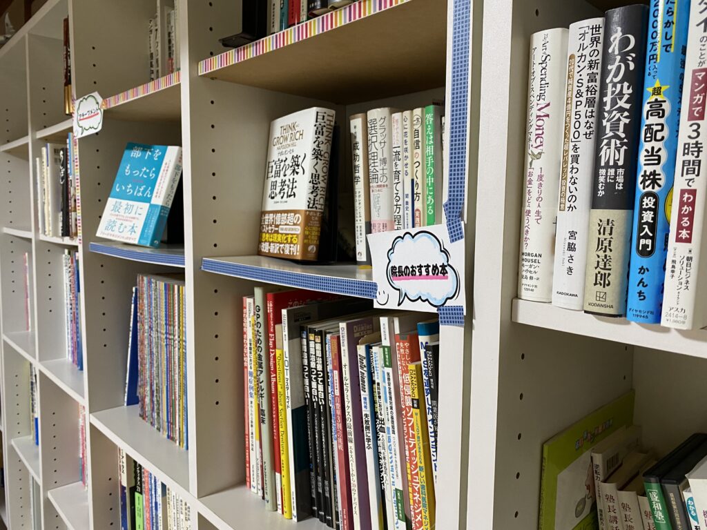 とりあえず次はどれにしようか…と本棚の前で眺めています。職員用貸出し本棚には院長おすすめコーナーもありますが、手前に本が気になります🤭
